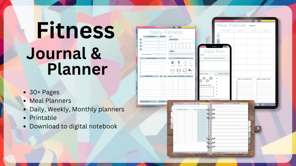 Get your fitness goals started and moving in our new vibrant and comprehensive 35-page Workout Planner and Journal – your ultimate companion on the journey to a healthier, fitter you! This colorful and thoughtfully designed planner is not just a fitness tool; it's your guide to achieving and exceeding your health and fitness goals.
